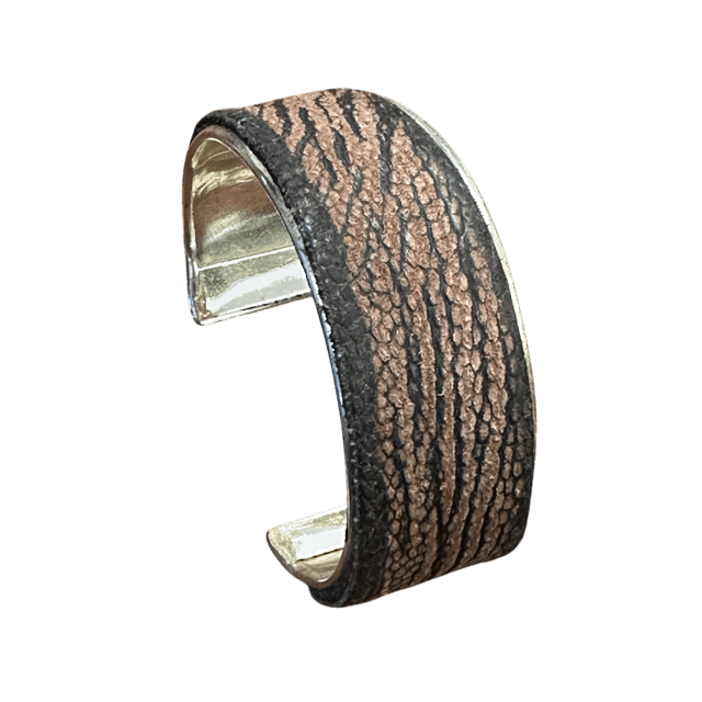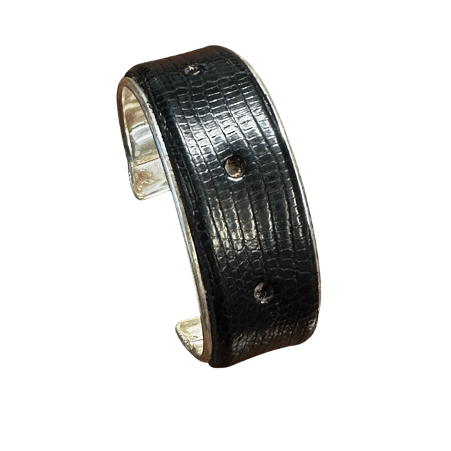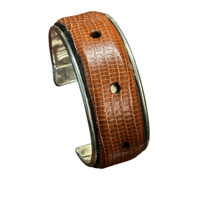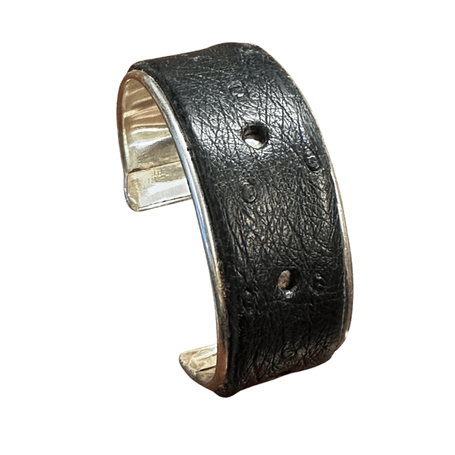 Bracelets (cuffs) in ostrich, ostrich leg, and lizard are a newcomer before Christmas 2025. Lightweight metal setting. The leathers come from Bolivia and South Africa. All the bracelets match leather belts in the same material. You can get them in 22 and 27 mm widths. In 2026, there will also be leather from crocodile, alligator, caiman croc, and python.
